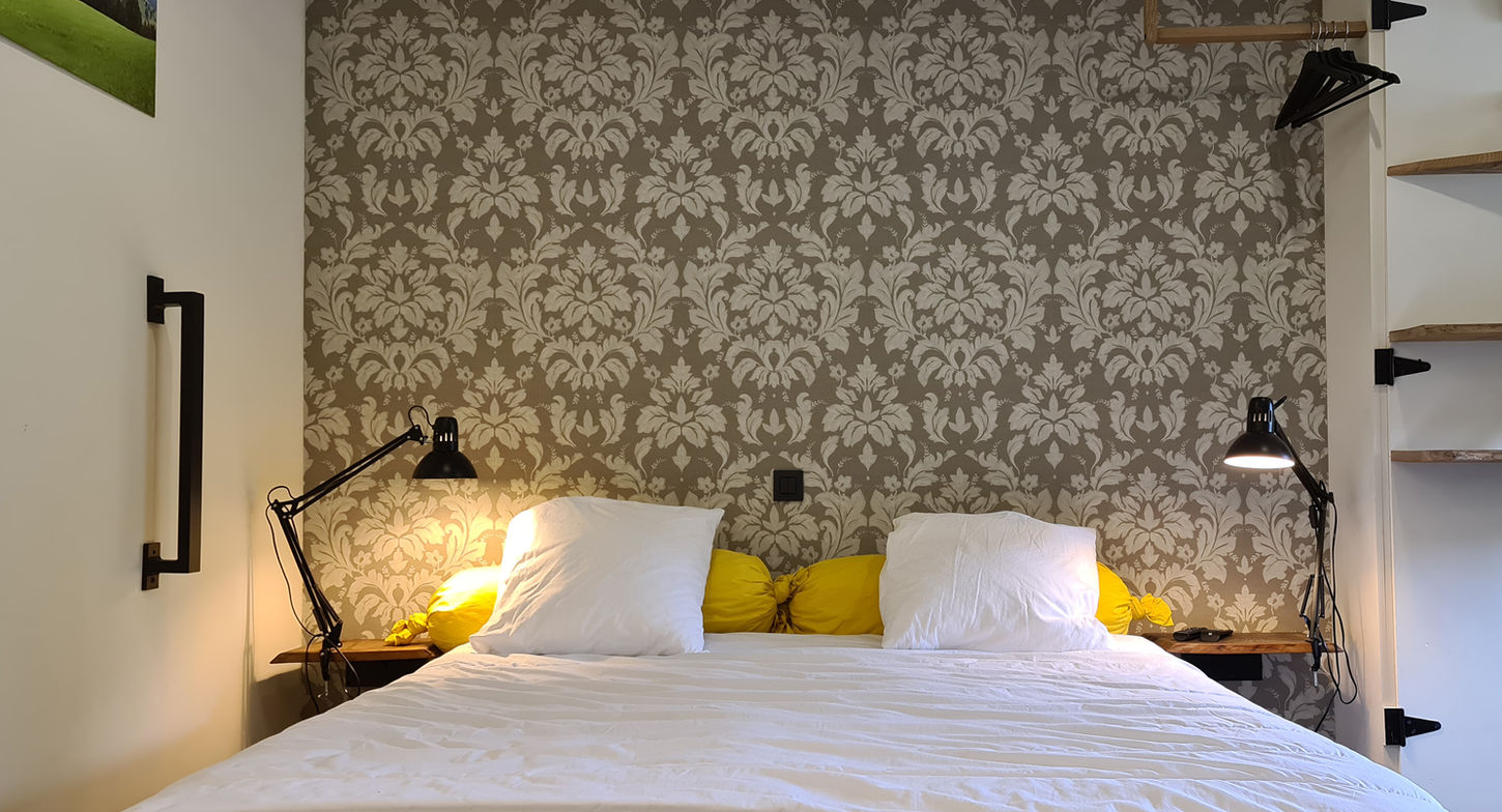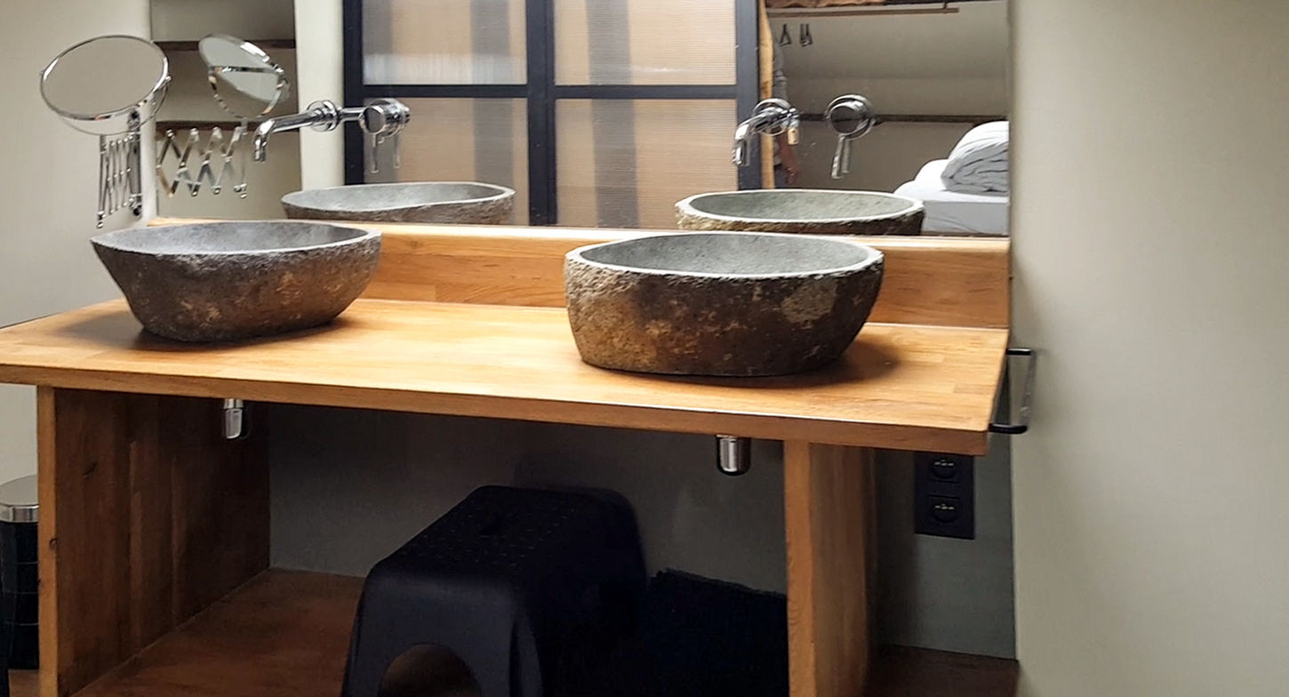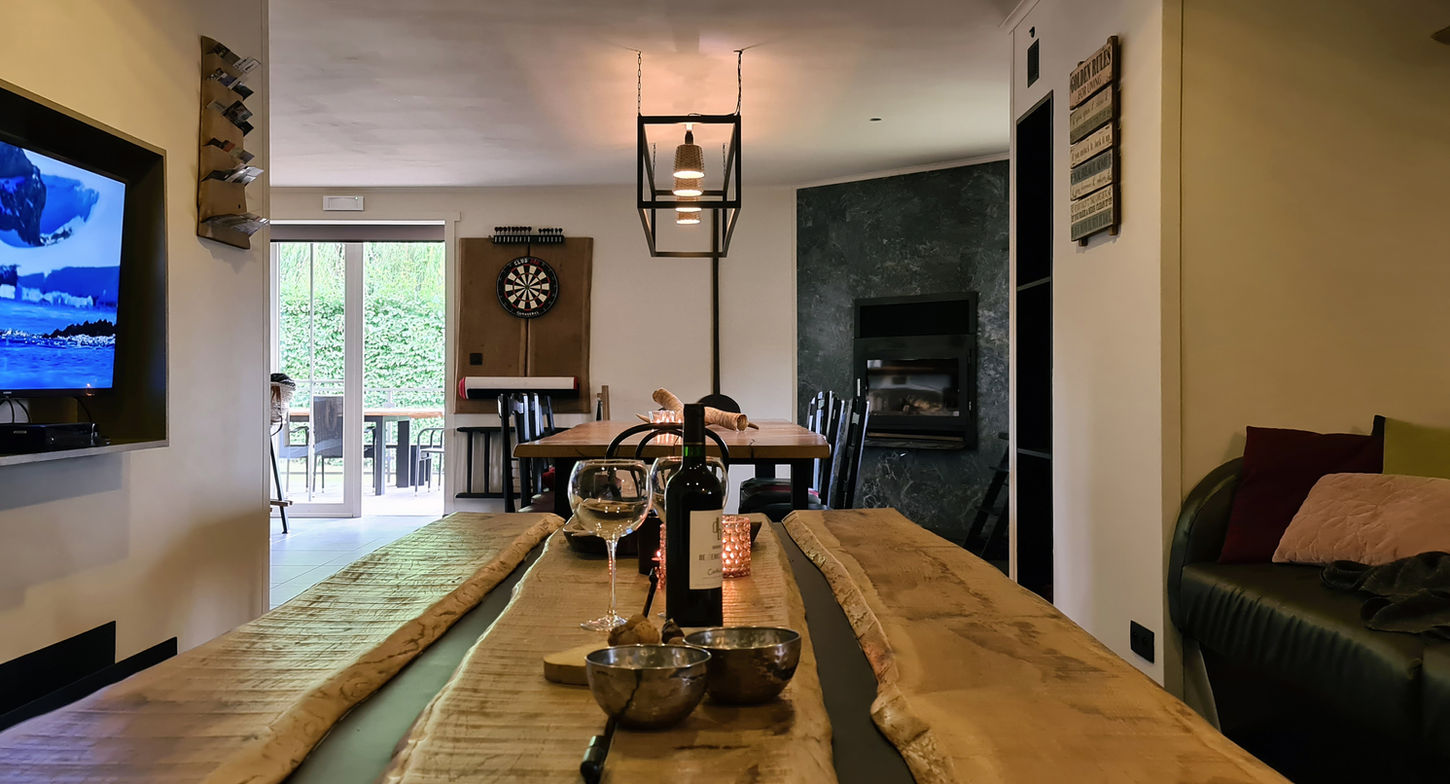 Vanuit de living daal je de trap af naar beneden, waar je het saunalandschap betreedt, dat bestaat uit levensgrote panelen met foto’s van Ardense natuur. Je waant je echt in het bos, tussen rivieren en watervallen. Heel bijzonder!