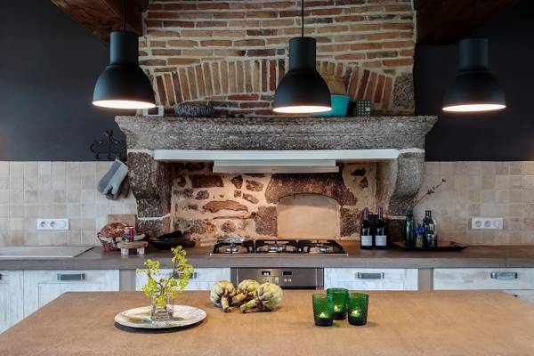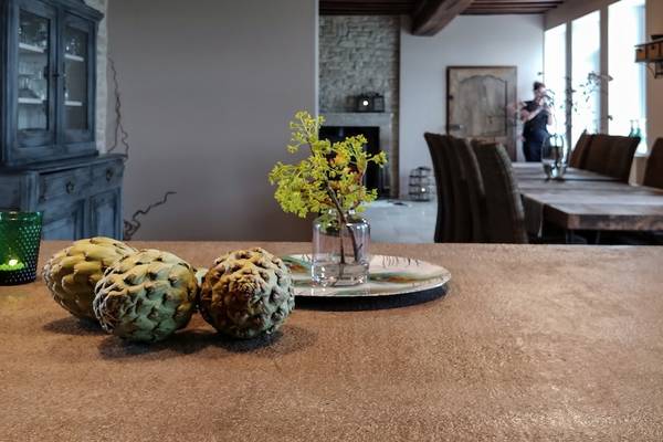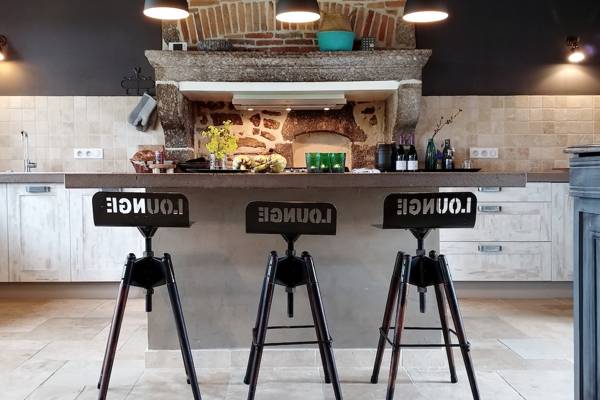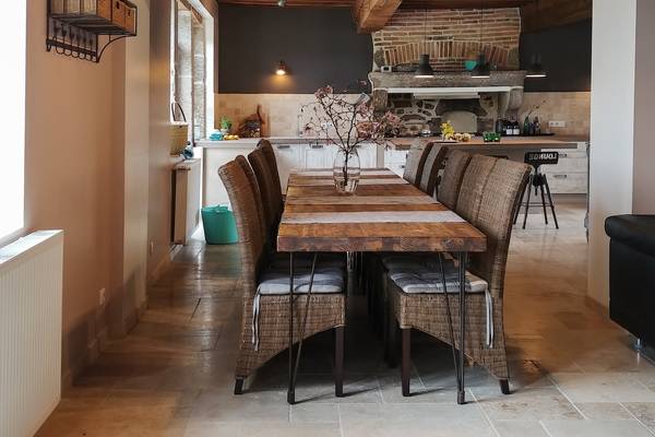 De leef-keuken vormt het hart van het huis. Hier is alle ruimte om met meerdere personen samen te koken, te lachen en te genieten van elkaars gezelschap. Een gezellig eiland met barkrukken nodigt uit om te zitten en het koken te volgen, terwijl de grote eettafel plek biedt aan twaalf personen en naadloos de keuken verbindt met de rest van het huis. De keuken is van alle gemakken voorzien: een 90 cm gaskookplaat, heteluchtoven, kombi-magnetron, vaatwasser en een ruime RVS-koelkast met aparte diepvries, aangevuld met een traditioneel koffiezetapparaat, waterkoker en broodrooster. De afzuigkappen zijn verwerkt in de grote schouw, waardoor koken en tafelen een ontspannen, plezierige ervaring wordt.
