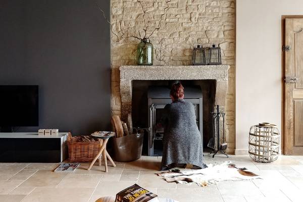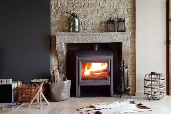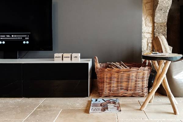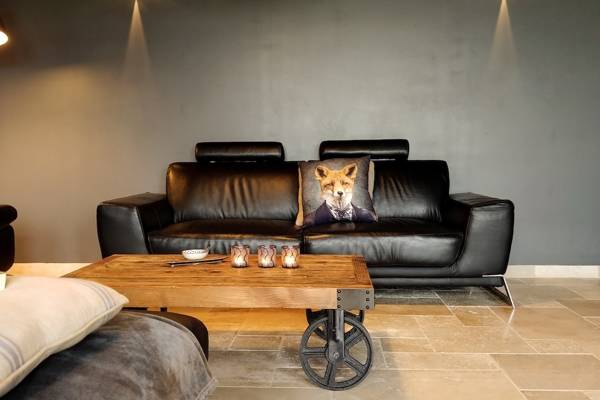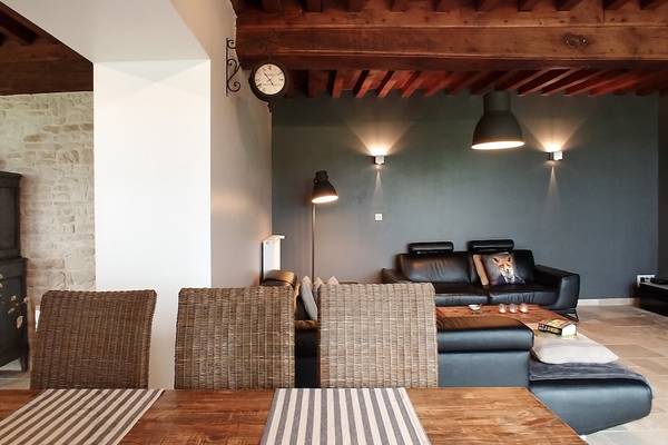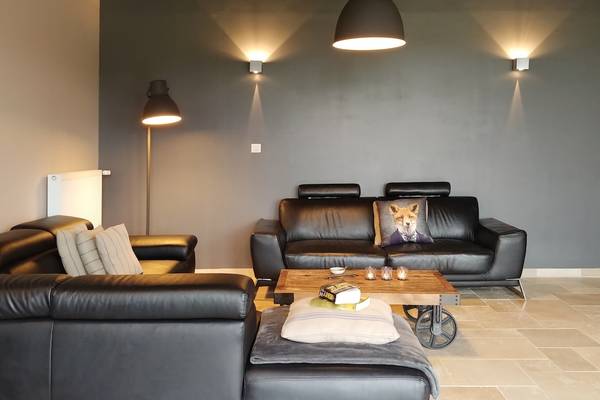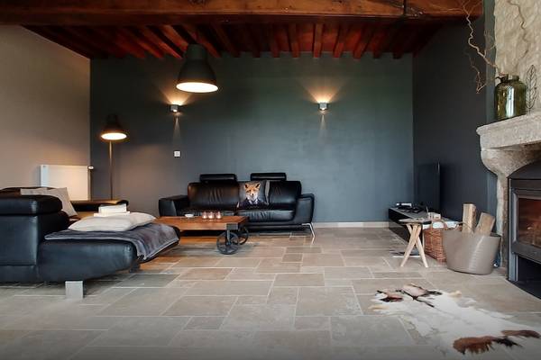 De living, uitgevoerd in zachte grijstinten, straalt rust en comfort uit. Een royale modulaire loungebank nodigt uit om na een actieve dag in de omgeving weg te zakken met een goed boek of een film. De houtkachel zorgt binnen enkele ogenblikken voor aangename warmte, terwijl het uitzicht op het omliggende landschap voor een gevoel van sereniteit zorgt. Voor moderne ontspanning is er een flatscreen-tv en draadloos internet beschikbaar.