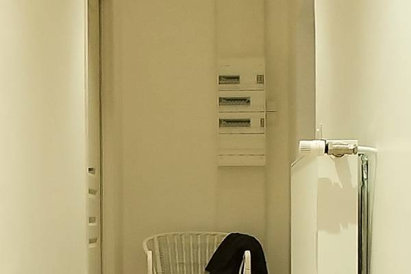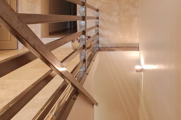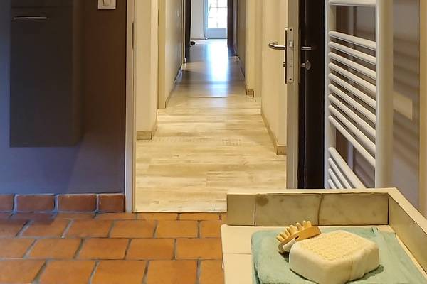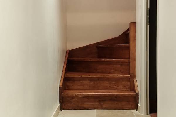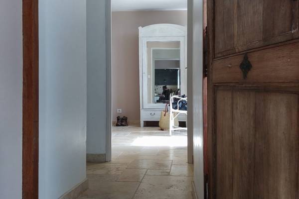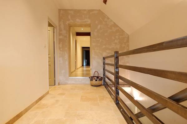 Bij aankomst aan de achterzijde van het huis, waar u uw auto gemakkelijk kunt parkeren, stapt u binnen in een ruime, lichte hal. De vloer van lokale natuursteen en een praktische garderobe voor jassen en schoenen geven meteen een gevoel van huiselijkheid. Vanuit hier heeft u toegang tot de keuken en leiden de trappen naar de eerste verdieping.