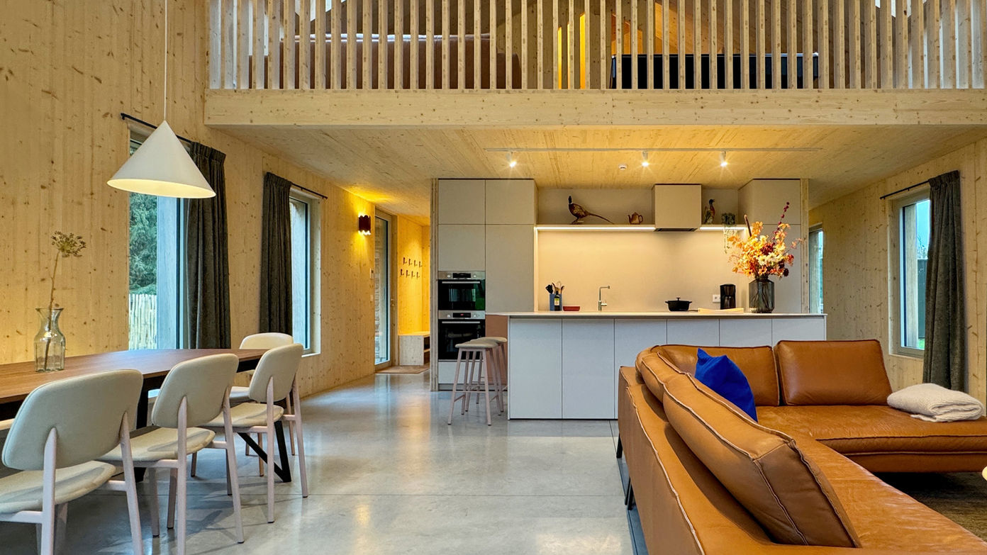 Stap binnen en laat je meevoeren door de ruimtelijkheid en warmte van deze lodge, waar comfort en esthetiek in perfecte harmonie samenkomen. Een volledig uitgeruste keuken nodigt uit om heerlijke gerechten te bereiden, een gezellige eettafel om samen te genieten, en een knusse zithoek rond de open haard biedt het ideale moment van ontspanning. Via vloeiende overgangen betreed je het uitnodigende terras, omringd door de rustgevende natuur.